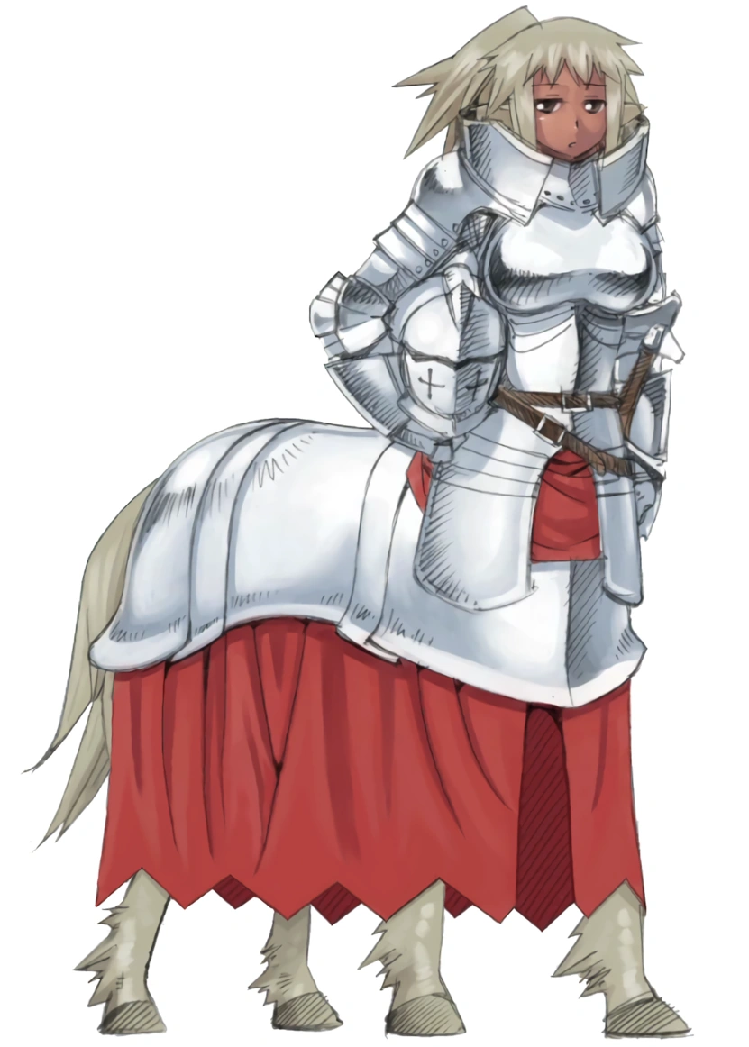 The Centaur (ケンタウロス族, Kentaurosu-zoku) are a demi-human liminal race with the upper body of a human attached to the body of a horse and equine ears. Herbivores, centaurs are normally found in grasslands and savannas, and are a race of nomads who become brave warriors in times of conflict.